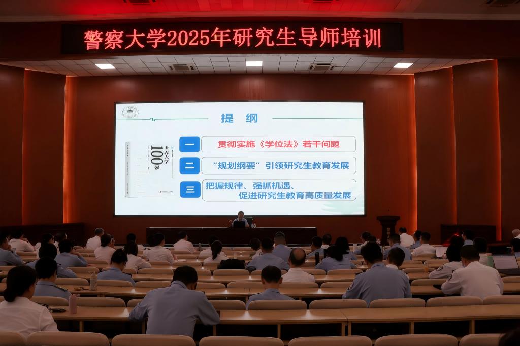 9月24日下午,警察大学邀请中国学位与研究生教育学会副会长兼学术委员会副主任、北京理工大学研究生教育研究中心主任王战军教授来校,在老报告厅作了题为《实施<学位法>加快研究生教育高质量发展》的讲座。讲座之前,校长吴立志、副校长杜旭宇与王战军教授进行了座谈交流。副校长杜旭宇主持讲座,全体研究生导师、助理导师、研究生教育管理人员参加讲座。