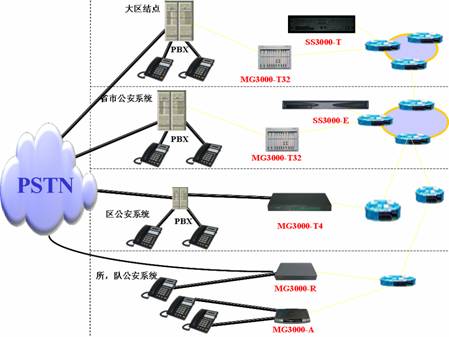 在各省地市公安网络中心配置语音服务器SS3000-E和中继媒体网关MG3000-T32, MG3000-T32通过10/100Base-T以太网接口连接IP网络,支持多路并发的语音呼叫,在提供数据接入的同时,成功的实现各级单位的语音业务的接入以及享受系统提供多种增值业务,以满足最终电话用户的需求。