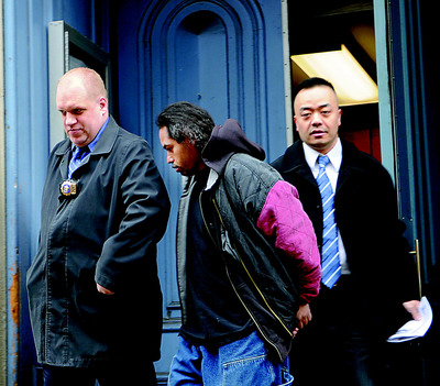 假冒警察抢劫的28岁抢匪Santiago(中)26日顺利落网,图右为探员李立文、左为探员Chris Stafford。 (美国《世界日报》/简一夫 摄)