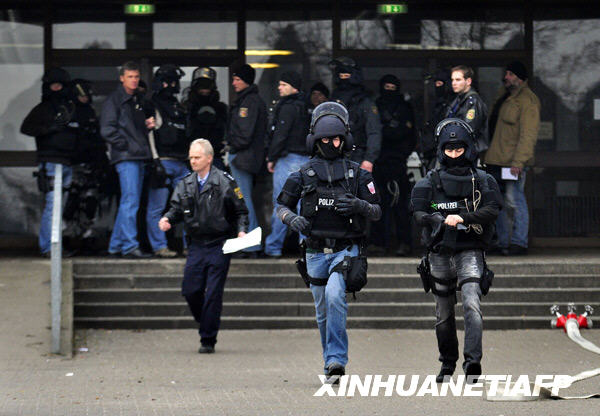 2月18日,在德国南部路德维希港,两名全副武装的警察离开发生命案的职业学校。
