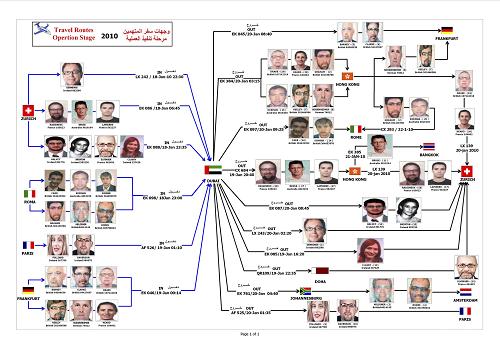警方说,嫌疑人在暗杀行动中担任主要角色或负责暗杀前的协助和准备工作。他们暗杀前曾穿梭往返于6个以上的国家,并至少4次造访迪拜。由于嫌犯中有14人在预订旅馆和机票时使用过同一家美国银行发行的信用卡,警方才捕捉到他们的行踪。