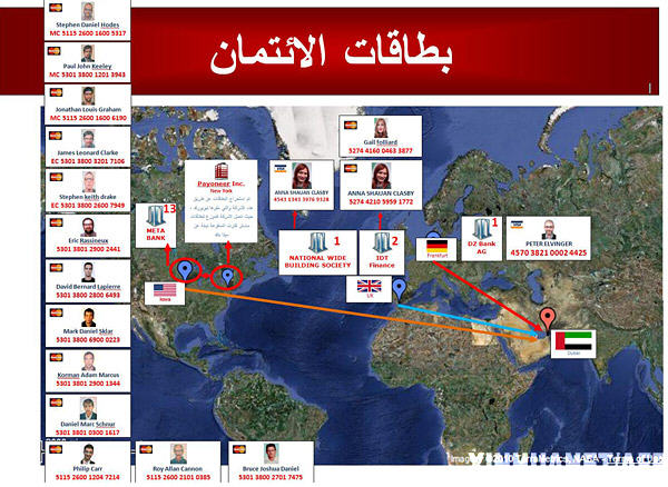 这张2月24日阿联酋迪拜警方公布的照片显示的是暗杀马巴胡赫的嫌疑人信用卡使用线路图。迪拜警方24日发表声明说,涉嫌暗杀巴勒斯坦伊斯兰抵抗运动(哈马斯)领导人马哈茂德·马巴胡赫的嫌疑人数已升至28人,其中包括先前落网的被关押在迪拜的2名巴勒斯坦人。新华社/法新