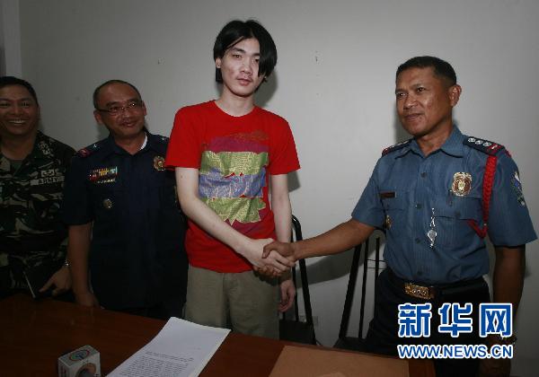 7月6日,在菲律宾南部城市三宝颜,获救中国公民吴锡利(右二)在当地警察局和一名警官握手。