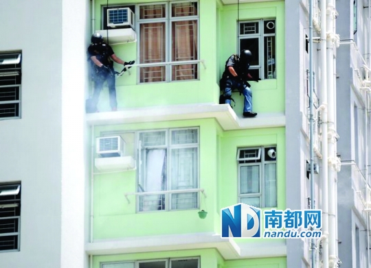 南都讯(记者 康殷)香港警队精英飞虎队的两名警员,缒(读音zhuì,用绳索拴住人或物从上往下放)降在距离地面10层高的大厦窗台,手持枪械戒备。屋内突然传出枪声,飞虎队员随即从屋门和窗外攻入室内。