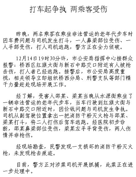 经了解,受害人邵某、梁某当晚从石家庄市水源街乘坐了一辆非法营运的老年代步车,当车行驶到红旗大街与新石中路交口附近时,因价钱问题与司机发生争执。司机从副驾驶位置拿出一把消防干粉灭火枪与邵某、梁某打斗,将二人打伤后驾车逃跑。经医院初步诊断,邵某鼻梁部位受伤,梁某左手手背受伤,两人伤情并非枪伤。