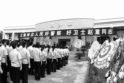 赵重的牺牲,揪着人们的心,给人们的心灵以强烈的震撼!一时间,小小的灵堂内,站满了前来为赵重送行的人们;灵堂外面,几百名民警默默地站在门口,眼中闪烁着泪花,陷入深深的追悼与怀念中……