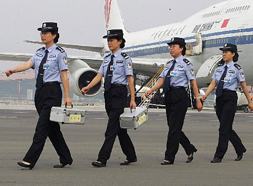资料图片:7月25日,北京出入境边检总站特殊勤务检查队女子执勤组正式成立。 这支队伍由20名边检女民警组成。她们将专门负责各国元首、政要及来访代表团的边防检查事务,提供快速、安全、优质、高效的出入境服务。 新华社记者 唐召明 摄