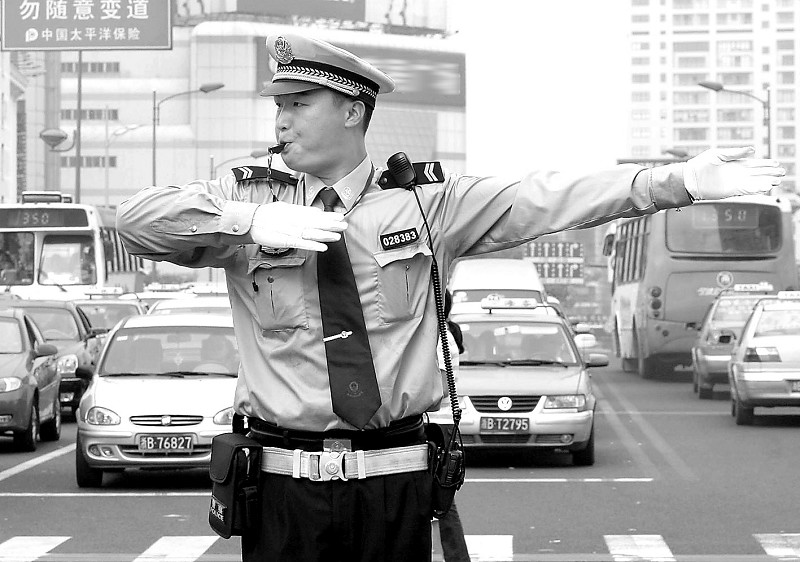 昨天是新的交通警察指挥手势正式施行第一天。我市130余名交警分别亮相于市区10个主要路段岗,向广大市民和驾驶员展示新交通指挥手势。图为江东江厦桥岗交警规范的新交通指挥手势。 (胡建华宋惕安陆明光摄)