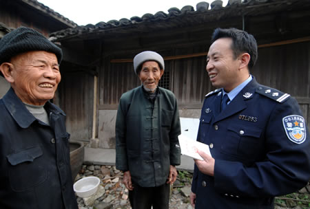 浙江省温岭市温峤派出所颜正富警务室警察颜正富(右一)正在江厦村与村民亲切交谈,了解民情。