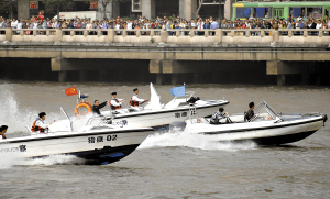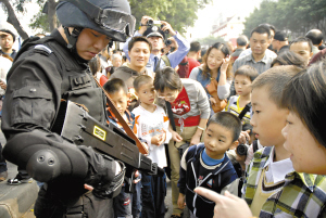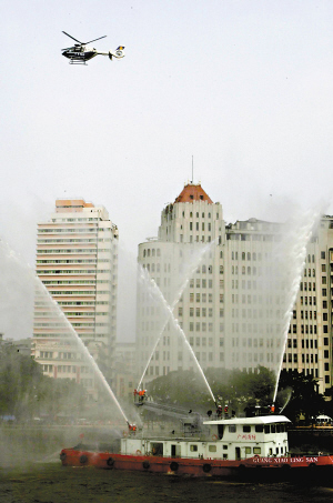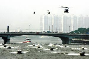 昨天,主题为“百年水警,再创辉煌”的2007年广州警察开放日活动在滨江西路水警码头和人民桥至解放大桥之间的珠江河面举行。珠江上,海空合演水上反劫持精彩好戏;珠江边,水警雄师展示船艇、潜水等精良装备;部分市民群众还获邀乘坐警用快艇出航。
