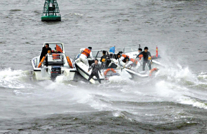 10时30分左右,江面突然掠过急促引擎声!水上反劫持演练开始。两名“犯罪嫌疑人”驾驶一艘民用快艇抢劫作案后,劫持一名人质逃窜。接到110指挥中心指令的广州水警迅速派出两艘警用快艇在警用直升机配合下展开追捕。“犯罪嫌疑人”逃到水警码头对开水域时,为摆脱追捕,竟将人质和赃物推入江中,继续驾船疯狂逃窜。水警兵分两路,一艘救助落水人质,另一艘继续追捕。两名水警立即跳入江中将落水人质救上快艇。而负责追捕的水警快艇则在直升机配合下,紧紧咬住“犯罪嫌疑人”驾驶船只。正在附近水域执行巡逻任务的另一艘快艇接到增援指令后迅速赶来堵截。两艘水警快艇以夹击之势,将“犯罪嫌疑人”驾驶的船只迫停。两名水警跃入江中,将一名跳水逃跑的嫌疑人抓获。跃上嫌疑船只的水警也将驾驶位上的“犯罪嫌疑人”制服。为了获取犯罪证据,三名“蛙人”跃入水中,成功将“犯罪嫌疑人”抛入江中的赃物打捞出水。