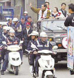 据报道,马英九29日到台北县一、二、三选区,陪同党籍“立委”候选人吴育升、柯淑敏和朱俊晓进行车队扫街拜票。马英九几乎走到哪里都笑容满面,好心情全写在脸上。不过,马英九的特勤维安层级似乎有所加强,譬如宣传车上站在他旁边的随扈人员,手持透明的压克力板阻挡四处飞射的鞭炮,台北县警局警察还携带防弹盾牌,不过警察并未派上用场。
