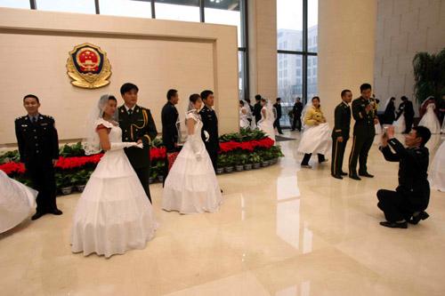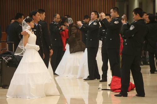 下午4点,位于北京东长安街的公安部办公指挥大楼迎来了一群特殊的客人——参加公安部2008年春节电视文艺晚会集体婚礼的100对基层新婚民警夫妇。此刻,他们怀着激动和幸福的心情,等待着人生中一场特殊的聚会。