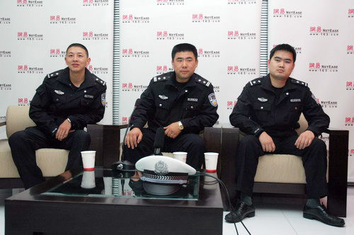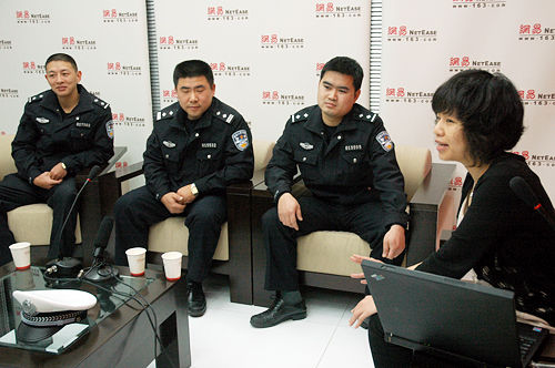 广州火车站一线民警作客网易 从左至右分别为:流花交警大队机动中队民警庄伟涛、广州市公安局流花交警大队机动中队中队长连忠伟、广州市公安局流花交警大队机动中队五中队民警蔡敬宇及网易主持人许晓