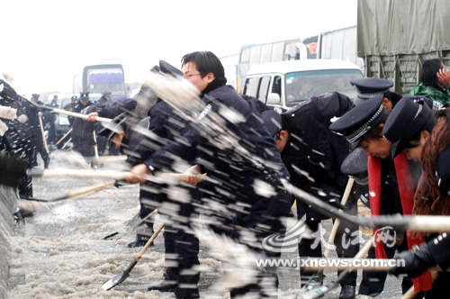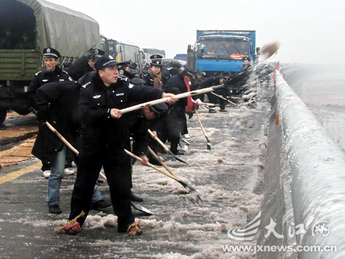 14日,大桥管理局调砂,九江交警调车,往大桥上铺撒砂,使得大桥得到了缓慢通行。14日晚又降大雪,桥面再次结冰,管理局又采取撒盐融雪的措施使大桥得到畅通。同时,九江市永修、共青城、星子、德安、九江5县也承担了大量车辆分流任务,各地顶住压力,有力地配合了城区主战场的疏导任务。为了使过桥车辆能走得了,湖北交警全力维护105国道的畅通,九江市交警支队则主动承担了整个长江大桥的值守任务。为了南北大动脉的畅通,九江警方与相关部门、兄弟省市共同打了一场协同攻坚战。