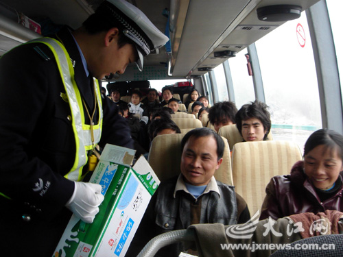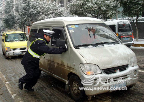 从1月13日晚上起,九江市全体交警开始24小时上路执勤,在国道、省道以及县道和乡道展开巡查,对陡坡、涵洞、桥梁、临崖、傍水等危险路段采取逐人定点执守,疏导交通。根据道路状况,对急于回家过年的客运车辆,按照上级党委政府要求,交警能不封路的尽量不封路。遇到危险路段,执勤交警提示乘客下车步行,待空车通过危险路段后乘客再上车。全市各个县区大队之间相互协调,分时分段、互相放车。