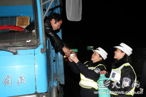 15日晚,九江市委常委、政法委书记、公安局长叶国兵一行,在九(江)景(德镇)高速路荷花垄入口转盘处看望滞留司机和旅客时,听到了这样一段发自肺腑的话:“我跑了20多年的车,走南闯北,但从未遇到过这么好的警察!”这位浙江乐清市的大巴车司机王师傅,由湖北宜昌开车路经九江,已在此滞留2天了。此刻,他端着九江交警送上的一碗热气腾腾的姜汤,紧紧拉着叶书记的手不放,热泪盈眶。