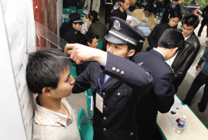 | 报考警察者接受身高检测 记者 欧阳祖兵 摄(资料图片) |
