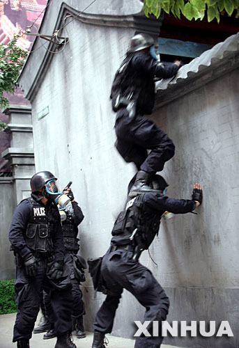 2007年4月27日,特警队员在北京进行解救人质、抓捕嫌疑犯的演示。当日,北京市启动2008年奥运会安保实战培训,公安、武警等奥运安保队伍将根据奥运期间可能出现的突发事件以及如何应对展开培训。实战培训分为基础培训、模拟演练和实战演练三个部分,至2008年7月结束。 新华社发(刘永生 摄)