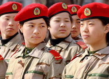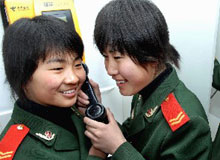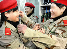 3月5日,17岁的赵倩(左)与18岁谢婷婷第一次穿上“红色贝雷”作训服显得格外兴奋。
