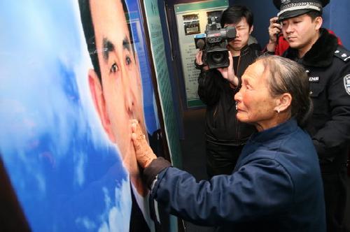 3月9日在民警陈纪平同志纪念馆里,陈纪平母亲抚摩儿子的遗像。(警方供图)