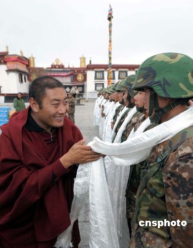 3月21日,拉萨大昭寺的僧人向在大昭寺广场上的武警官兵敬献哈达,他们还为官兵们送上了生活慰问品。 中新社发 廖攀 摄