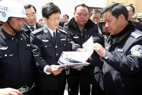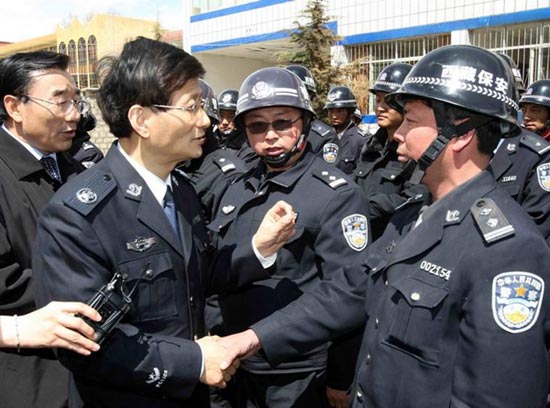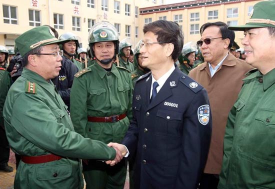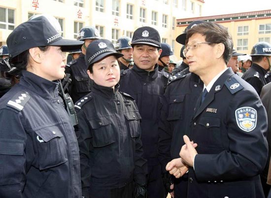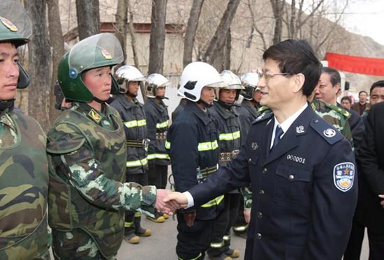 3月23日至26日,国务委员、公安部部长、武警部队第一政委孟建柱不顾高原反应和旅途劳顿,先后前往四川、西藏、青海、甘肃、云南五省区,亲切看望和慰问奋战在反分裂、反渗透、反颠覆斗争第一线的公安民警、武警官兵。孟建柱说,在处置打砸抢烧暴力事件中,你们听从指挥,迅速行动,不怕牺牲,忍辱负重,用自己的汗水乃至鲜血换来了藏区的民族团结和社会稳定,为维护法律尊严和人民群众的根本利益做出了重要贡献,党和政府感谢你们,人民感谢你们。希望你们高举维护社会稳定、维护社会主义法制、维护人民群众根本利益的旗帜,永葆忠于党、忠于祖国、忠于人民、忠于法律的政治本色,继续发扬特别能吃苦、特别能战斗、特别能奉献的精神,为维护和确保藏区社会稳定、实现民族地区长治久安再立新功。( 摄影:赵飞)