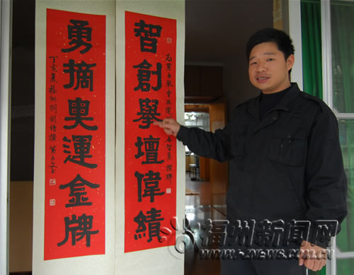 从小喜欢古诗词、身为司法警察的39岁市民刘新传,13日向福州日报记者展示了自己创作的40多副以迎北京奥运为主题的楹联。