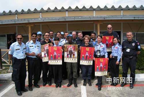 赴科索沃维和民警——来自“年画之乡”四川德阳市公安局的女民警刘莉,本月中旬将中国第一套“警察年画”带到警队时,受到外国同行的热捧。她所带去的近50张年画当场被一抢而空。小小年画大大地增进了不同国家民警间的友谊。