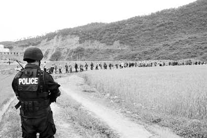 中午,监狱成建制地往山下转移,监狱干警将1300多名服刑人员分成四个方队,每个方队之间间隔三到五百米,特警和武警走在最前面和最后面,方队之间保持联系。