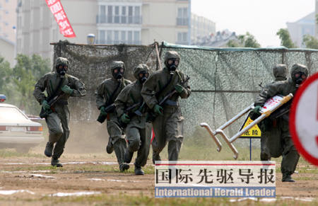 资料图片:2007年6月,河北省秦皇岛举行军警民奥运安保实兵演练,演练了处置化学恐怖袭击、反劫持等课目。