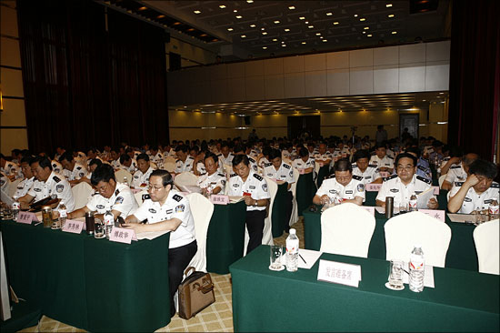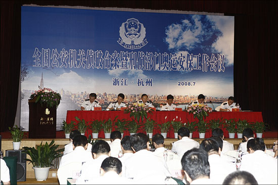 | 7月1日至2日,公安部在浙江杭州召开了“全国公安机关侦破命案暨刑侦部门奥运安保工作会议”,部署全国公安刑侦战线做好奥运安保工作,继续深化侦破命案工作。图为会议现场。 |