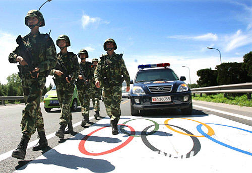 7月12日,奥运专用道武装处突车组出征仪式在北京举行,39辆崭新的防弹车正式上路执勤,担负奥运会专用道路的巡逻、处理突发事件、反恐任务。