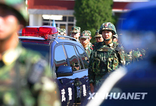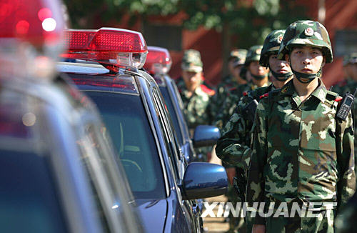 7月12日,奥运专用道武装处突车组出征仪式在北京举行,39辆崭新的防弹车正式上路执勤,担负奥运会专用道路的巡逻、处理突发事件、反恐任务。 新华社发