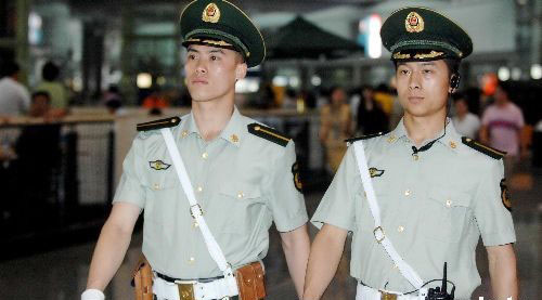 7月15日,北京市公安局正式启动巡逻防控“三道治安防线”工程,由民警、武警、辅警、治安保卫人员组成联合工作小组,在进入北京的公路、车站、机场上设置数百个卡点,对进京的重点列车实施人员和货物的检查。 中新社发 陈文 摄