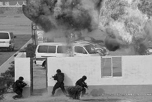 在指挥员下达攻击令的余音声中,突击分队兵分5路向目标发起攻击:从地下钻出的特战队员,对大厅两名歹徒实施了无声射杀,迅速排除了出入口爆炸物,为救援行动打开了通道。空中垂降的特战队员从天窗潜入“歹徒”所在的楼层,乘坐攀登突击车的两组队员左右破窗,与空中垂降的战友同时攻入大厅,“歹徒”未及反抗,就被一一击毙或制服。楼顶的特战队员在对防护窗实施精确爆破后,利用绳索从天而降,破窗而入,身体腾空中,举枪击发,“歹徒”未及反应,就已中弹毙命,人质被安全解救。