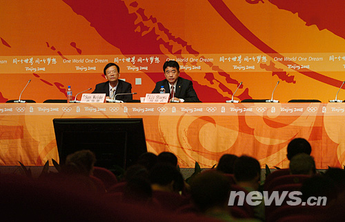 图为北京奥组委安保部部长刘绍武(右)回答记者提问。新华网 陈竞超 摄