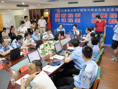 7月28日下午15时,厅机关一号楼9楼会议室,江西公安民评网现场,省委常委、政法委书记、公安厅长舒晓琴,省公安厅党委副书记段景来、省公安厅巡视员郭玉明率厅办公室、宣传处,刑警、交警、治安总队,出入境管理局、法制处等单位负责人与网友在线交流。