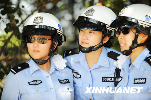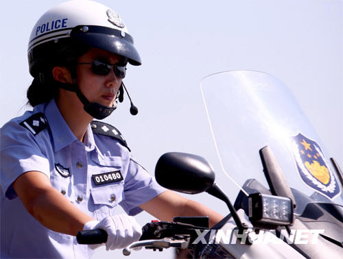 年轻漂亮的女骑警(8月3日摄)。当日,北京市公安局公安交通管理局组织骑警队在北京奥体中心附近进行展示活动,奥运带路队的女骑警和负责巡逻任务的骑警集体亮相,吸引了众多中外媒体。 新华社记者杨光摄