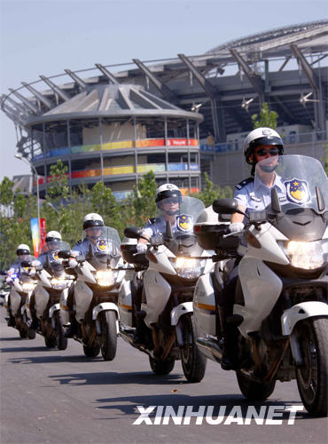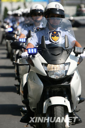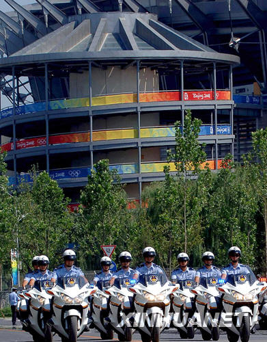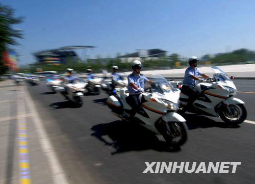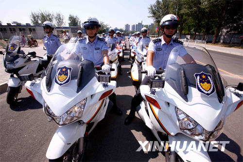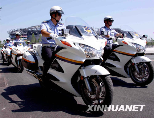 8月3日,北京奥运带路队的交警准备出发。 新华社记者 陈建力 摄