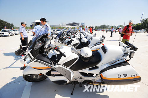8月3日,活动现场整齐停放着北京骑警的新摩托车。新华社记者李明放摄