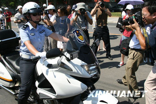 8月3日,参加“中海杯”2008中外摄影家聚焦北京交通摄影大赛的摄影家在拍摄女骑警。 新华社记者李明放摄