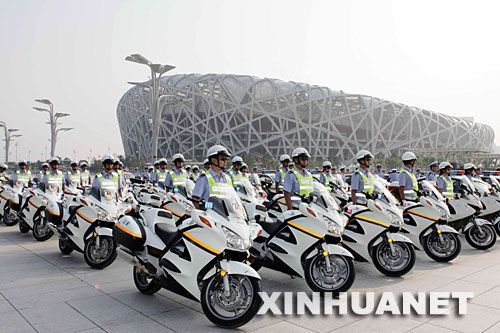 7月20日,北京奥运交通应急小分队在“鸟巢”前整装待发。 新华社发(李世贵 摄)