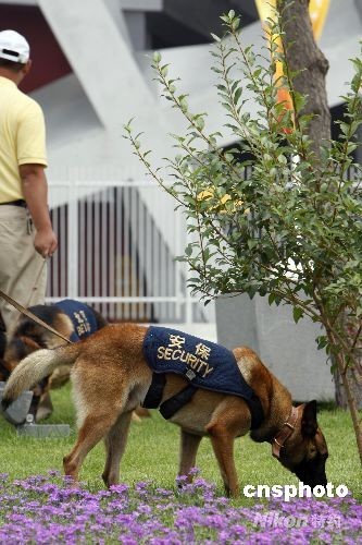 8月8日,第29届夏季奥运会将于当晚在北京奥林匹克公园内的国家体育场开幕,为保证开幕式的顺利进行,“鸟巢”周边安保措施升级。图为搜爆犬在“鸟巢”周边搜爆。 中新社发 杜洋 摄