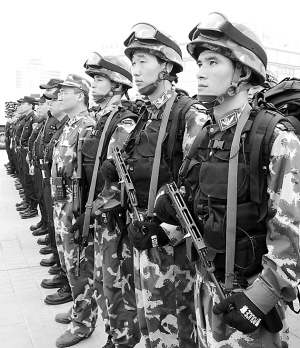 图为公安特警武警准备在街头武装巡逻。 张 震 摄