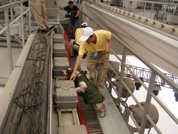 为实现“平安奥运”的奋斗目标,公安部刑事侦查局按照奥运安保工作的总体安排,调动全国警犬技术资源,全力支持各奥运赛区的奥运安保工作。经过前期的认真准备和刻苦训练,从7月份开始,公安部从全国抽调支援各赛区的警犬技术骨干与北京、天津、河北、辽宁、上海、山东的带犬民警组成的警犬技术团队已经全力投入到奥运圣火传递、涉奥场所防爆安检等工作中,全体带犬民警携搜爆犬发扬顽强拚搏、连续奋战的工作作风,在各涉奥场所搜出许多危险物品,清除大量安全隐患,在奥运安保的主战场上发挥了特殊重要的作用。近日,部刑侦局组成工作组,并从公安部属警犬基地、研究所、学校抽调犬病防治和训练专家,前往青岛、天津、秦皇岛等奥运比赛城市进行巡查督导,检查了解各地警犬训养和工作情况。现在,各地警犬技术工作团队已成为各奥运比赛城市安检工作的一支重要力量,广大带犬民警精神饱满,斗志昂扬,决心继续以最佳状态、最高标准全力以赴做好奥运安保工作。