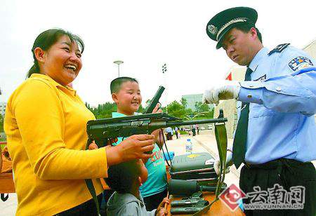 下午1时许,石林县体育场主席台一侧,禁毒宣传点、警务装备展示点、交通安全宣传点、消防器材展示点一一排开,前来参观的市民络绎不绝。警务装备展示点,网枪、路障破胎器、手枪和冲锋枪成了群众参观的重点。听了现场民警的讲解,一名小男孩接过一支77式手枪,拉拉枪栓,朝天扣动扳机。“哇,好过瘾!”他一会儿摸摸手枪,一会儿玩玩79式微型冲锋枪,还让父母为他拍照留念。