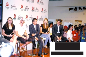 菲尔普斯(左二)到欧米茄展区参加活动,随卫队员在一旁警卫