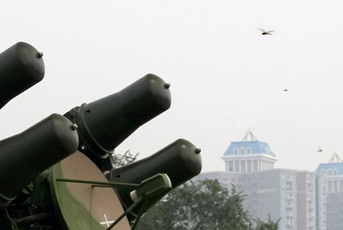 蜻蜓在鸟巢附近的导弹阵地低回、流连,描绘了一幅祥和画卷。谭超 摄 地面伏击——冷的面孔热的心 在战斗机起飞的同时,奥运场馆周围矗立起冰冷的高炮、令人生畏的导弹。历届奥运会都有教训:最大的危险总是从空中来。 如果说劫机猛于虎,那么在低空搞偷袭的小飞行器则是恶狼。 消灭威胁奥运的群狼,地面防空部队首当其冲。 据有资料显示,北京市二百公里范围内保有小型航空器共数十类近万件,地面管控复杂,一旦升空,处置的第一重任就压在地防部队身上。担负低空目标打击任务的高炮某旅,面临着前所未有的重任。旅领导不约而同想到一员老将——以“狡猾”著称的全军唯一士官航模专家吴宪枝。先后两次入伍,三十年磨一剑的老吴,成为总部挂号的航模专家,曾参与编撰全军航模训练大纲。这一次,旅里要请他担纲组建航模蓝军,逼着高炮群提高特种作战能力。最近这回交锋,老吴依然毫不客气,一上来就使狠招。 “奥运场馆以东,十六公里出现摇控飞行器,准备战斗!”老吴的“航空队”抵近阵地悄悄升空,留给炮群的预警时间不足十分钟。老吴下令:“无人机起飞后先高空飞行,故意被雷达发现。” 此举果然吸引炮火注意力,接近高炮射程时,无人机突然降低高度,从雷达屏幕上消失,只要几十秒内不被“击落”,突破防线十拿九稳!然而,实现情报共享的炮群已经产生“抗体”,无人机刚从雷达屏上消失,另一阵地上的瞄准具也已经将它套牢。“败仗吃得越多,越说明咱的防空体系经得住考验,咱心里高兴!”别看老吴平日一副铁面孔,但心里藏着十二分的热。老兵吴宪枝告诉笔者,连日来蓝军想方设计把空中情况搞复杂,多年积累的“歪招”、“怪招”轮番亮出,就一个目的:增强高炮群火力网的免疫力。对抗训练前一个月蓝军胜得多。后一个月还互有胜负,可最近一段时间,安保任务部队战法不断更新,蓝军多次向红军进行偷袭,均以失败告终。