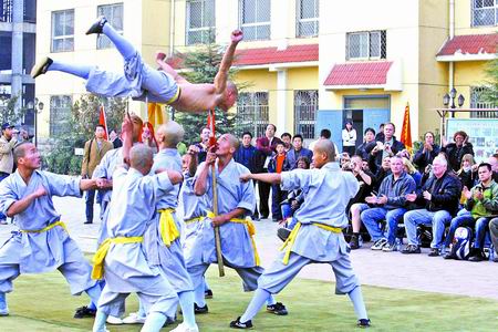 昨天下午4时许,少林寺武僧团培训基地迎来了64名美国洛杉矶县警察访问团的成员。在训练场上,武僧为美国警察表演了纯正的少林武术(如图)。飞针穿玻璃、钢枪刺喉、头断钢板等功夫,让客人们纷纷竖起了大拇指。表演结束后,美国警察纷纷离开座位,向武僧讨教功夫并合影留念。一名美国女警对记者说:“中国功夫很神奇,但以前只是在电影里看到过,这次亲眼所见,真的很厉害!”